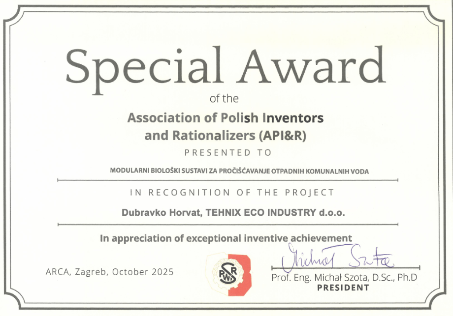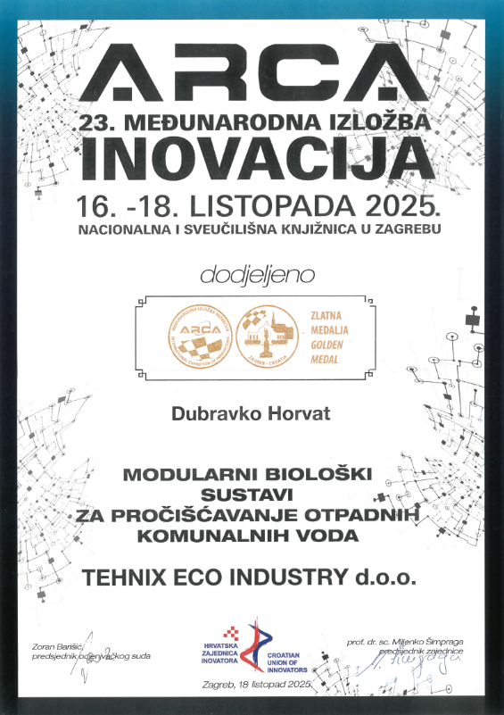 Na 23. međunarodnoj izložbi inovacija ARCA, održanoj u Zagrebu, Hrvatska zajednica inovatora dodijelila je zlatnu medalju za inovaciju „Modularni biološki sustavi za pročišćavanje otpadnih komunalnih voda“, autora Dubravka Horvata i tvrtke Tehnix Eco Industry.
