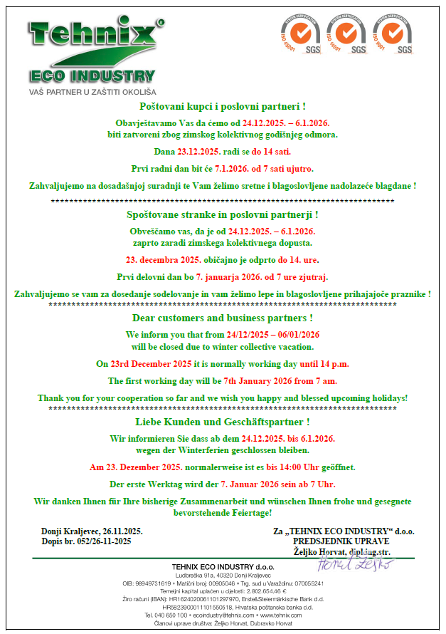 Obavijest o kolektivnom godišnjem odmoru